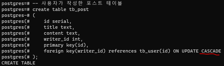 cascade๋ tb_user๊ฐ ์ญ์ ๋๋ฉด ์ฐธ์กฐํ๋ tb_post๋ ์ ๋ถ ์ญ์ ํ๋ ๊ฒ์ด๊ณ ,
