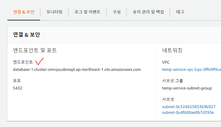 ๋ฐ์ดํฐ๋ฒ ์ด์ค ๋๋ฉ์ธ์ RDS ์ํธ๋ฆฌํฌ์ธํธ๋ฅผ ๊ธ์ด์ค๋ฉด ๋๋ค.