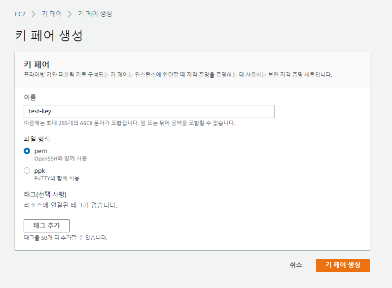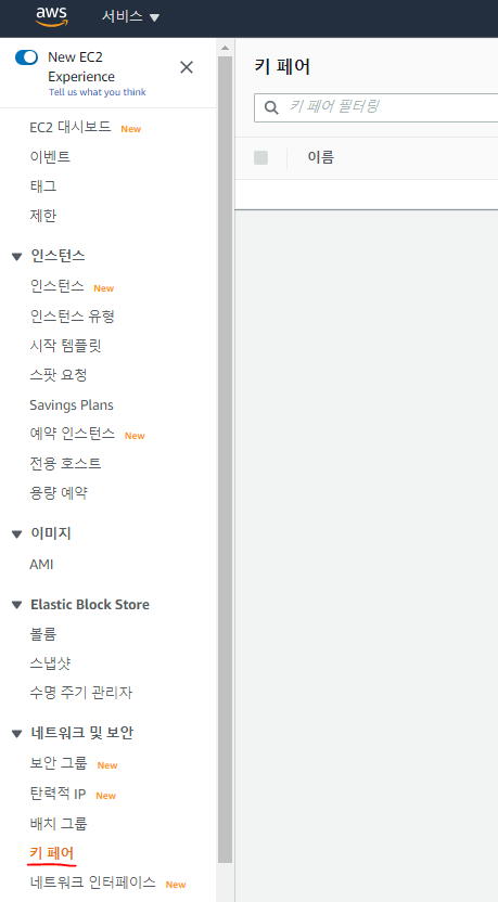 ์ด๋ฒ์ EC2->ํค ํ์ด๋ก ๋ค์ด๊ฐ์ ์์ฑํ๊ณ , ๋น๋ฐํค .pem์ ์ ๋ณด๊ดํด๋๋ค.