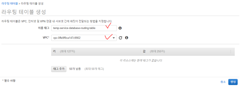 vpc๋ฅผ ์ ํํ๊ณ , ์ด๋ฆ์ ์ ์ง๊ณ , ๊ฐ์ฉ์์ญ ์ ํํด์ฃผ๊ณ , CIDR ์์ญ์ ์ ์ง์ ํด์ค๋ค.