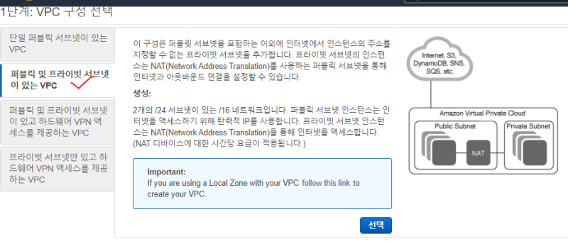 ์ด๋ฆ ์ ์ง๊ณ , VPC ๊ณ ๋ฅด๊ณ , ๊ฐ์ฉ์์ญ๊ณผ ์๋ธ๋ท์ ์ ํํ๋ค.