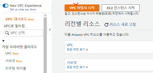 ๋์๋ณด๋์์ VPC ๋ง๋ฒ์ฌ๋ฅผ ํด๋ฆญํ๋ค.