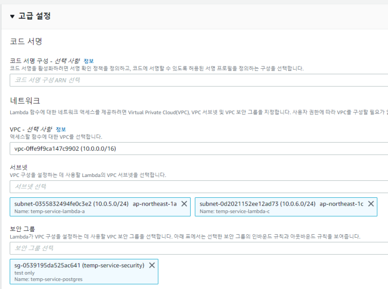 ์ด๋ ค์ธ ๊ฒ์ ์๋ค. ๋จผ์ VPC๋ฅผ ์ ํํ๊ณ ๋ฐฉ๊ธ ๋ง๋ ์๋ธ๋ท ๊ทธ๋ฃน์ด ๋ค์ด๊ฐ๋๋ก ํ๋ฉด ๋์ด๋ค.