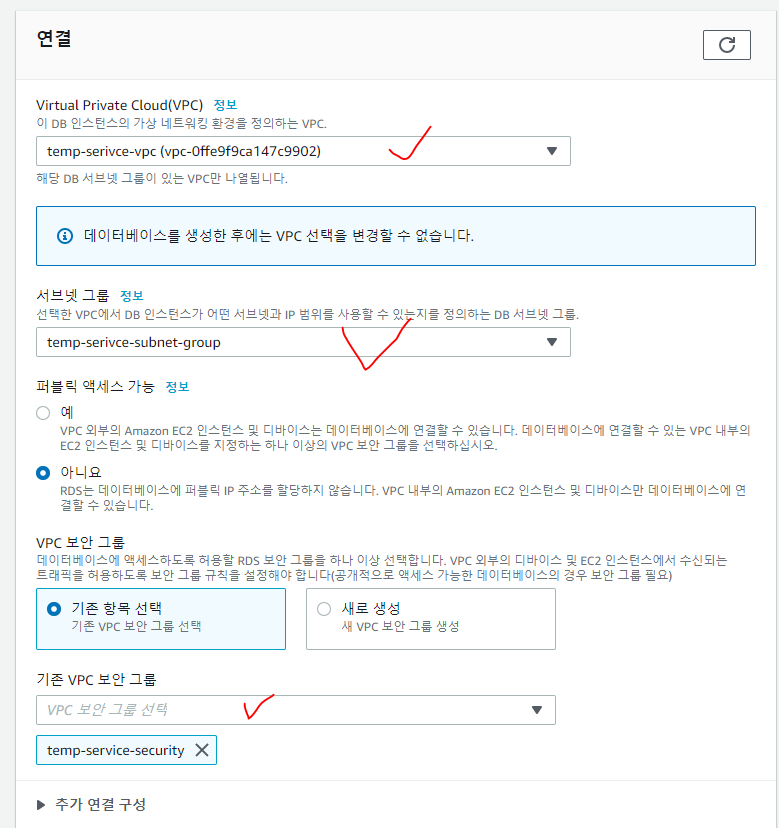 ๋๋ค๋ฅผ ๋ง๋ค๋, VPC์ ์๋ธ๋ท, ๋ณด์๊ทธ๋ฃน์ ์ ์ฉํด์ ๋ง๋ค์ด์ฃผ๋ฉด ๋๋ค.