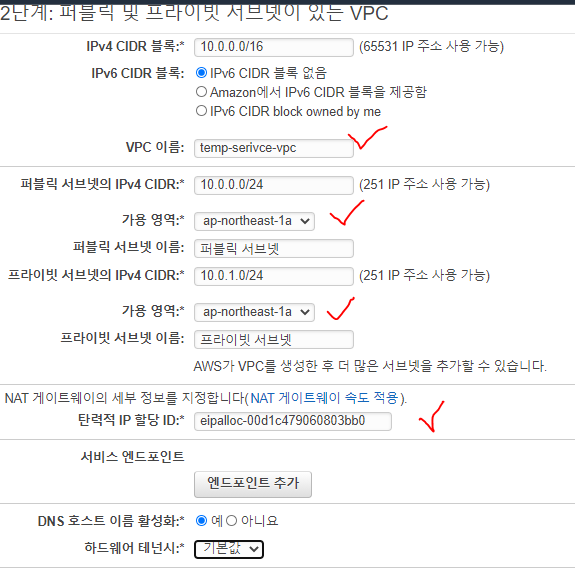 ์ด๋ฆ ์ ์ง๊ณ , VPC ๊ณ ๋ฅด๊ณ , ๊ฐ์ฉ์์ญ๊ณผ ์๋ธ๋ท์ ์ ํํ๋ค.