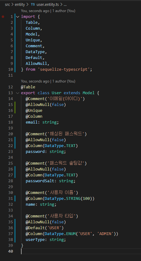 테이블 정의법은 기존과는 조금 다르다. 클래스를 통해 정의하고, 데코레이터로 컬럼에 대한 속성을 표기한다.