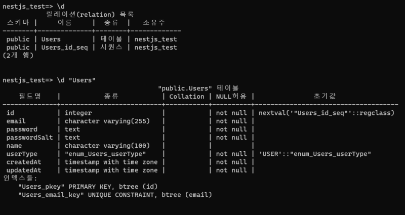 저래놓고 돌리면 엔티티를 정의한대로 실제 테이블들이 생성된다.