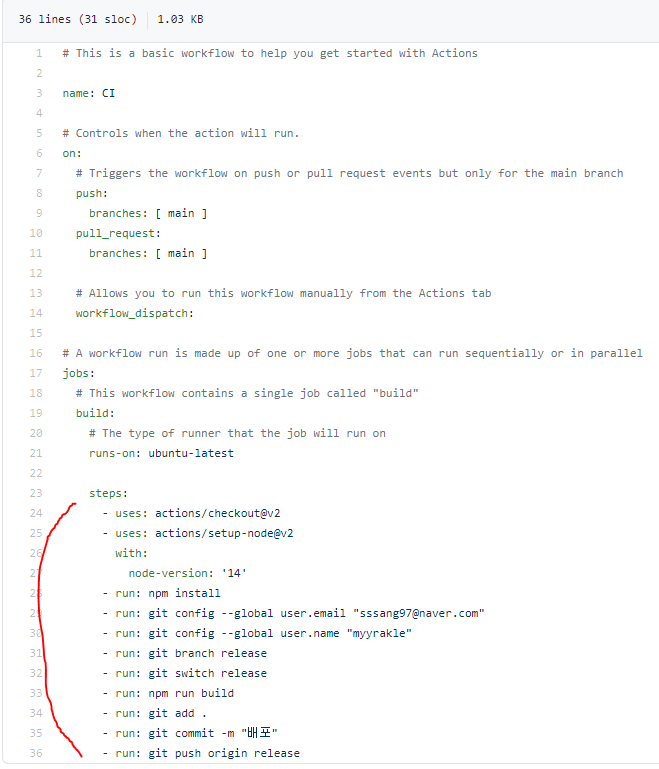 여기서는 main 브랜치에 push 했을때, 그리고 pull request가 왔을 때 액션이 실행되도록 되어있는 것이다.