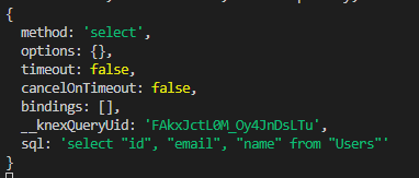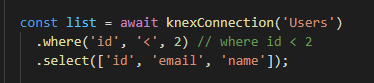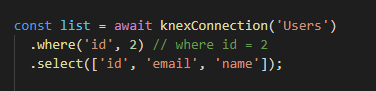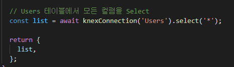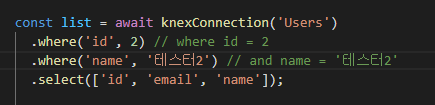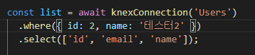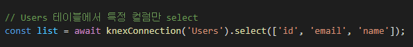 커넥션 객체로 함수를 호출하며 테이블을 지정해주고, 체이닝 메서드 select로 가져올 컬럼을 명시해준다.