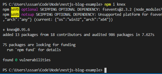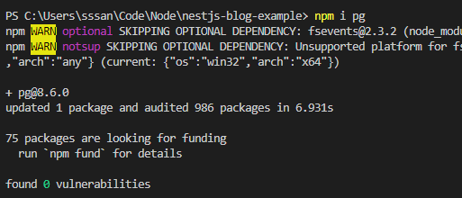 내 경우에는 postgres이기 때문에 pg를 설치한다.