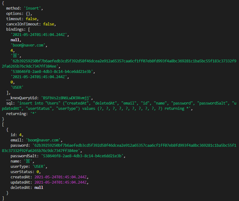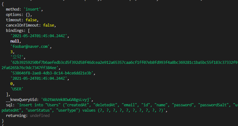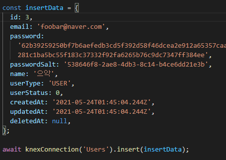 데이터의 삽입도 그리 어렵지 않다. 그냥 knex 함수로 테이블 객체를 불러온 다음에 거기에 insert 메서드로 삽입할 데이터만 전달하면 된다.