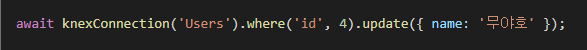 select와 동일하게 where로 변경할 로우의 조건절을 명시해주고, update에 변경할 값의 오브젝트를 넘겨주면 된다.