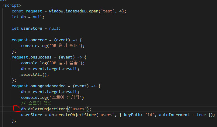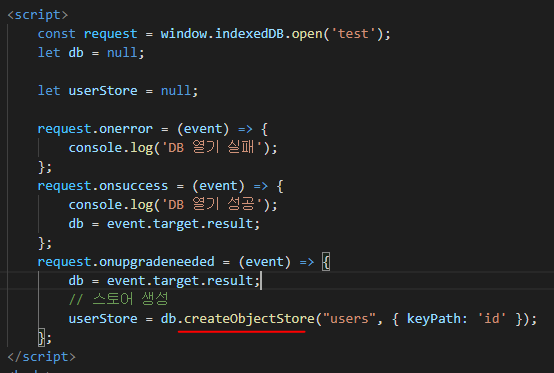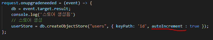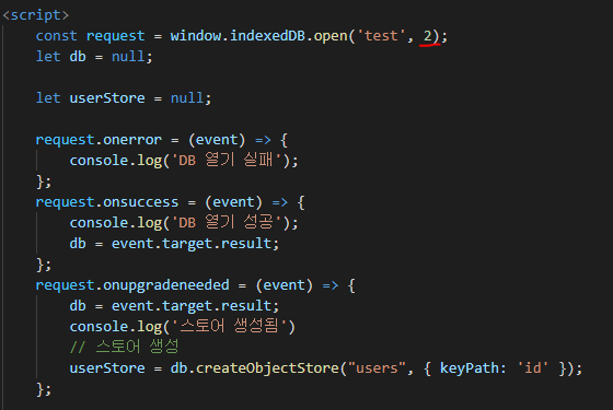 ๊ทธ๋ฆฌ๊ณ ์คํ ์ด๋ ๊ธฐ๋ณธ์ ์ผ๋ก onupgradeneeded์์ ์ ์ํด์ผ ํ๋ค. ์๊ทธ๋ฌ๋ฉด ์ค๋ฅ๋ฅผ ๋ด๋๋ผ.