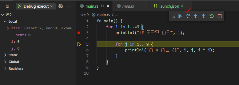 그리고 두번째 버튼은 단위실행이라고 그냥 한줄씩 실행되면서 멈추게 해준다.