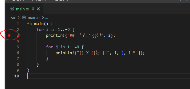그럼 시뻘겋게 마킹이 되는데, 이게 바로 중단점이다.