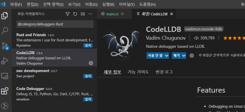 디버깅을 하려면 CodeLLDB라는 확장이 필요하다.