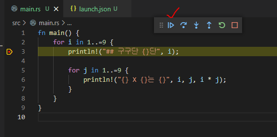저 화살표 버튼은 그대로 실행을 진행한다는 뜻이다.