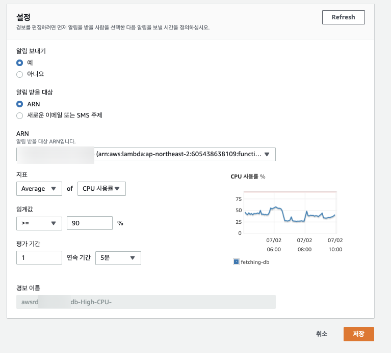 가장 간단한 방법은 트리거할 람다를 만들고 그걸 경보에 발동되게 붙여주는 것이다.