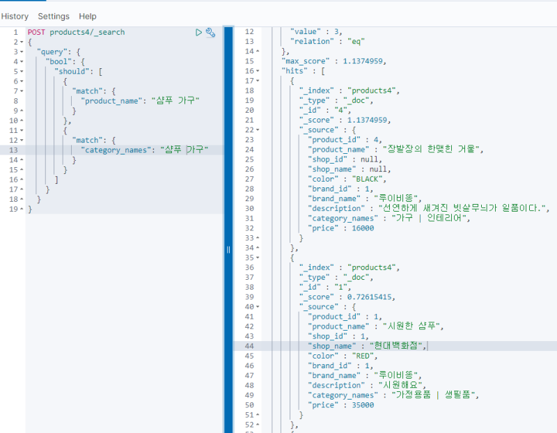 상품명 중에 "샴푸"와 일치하는 것이 있고, 카테고리 중에서 "가구"와 매칭되는 것이 있다.