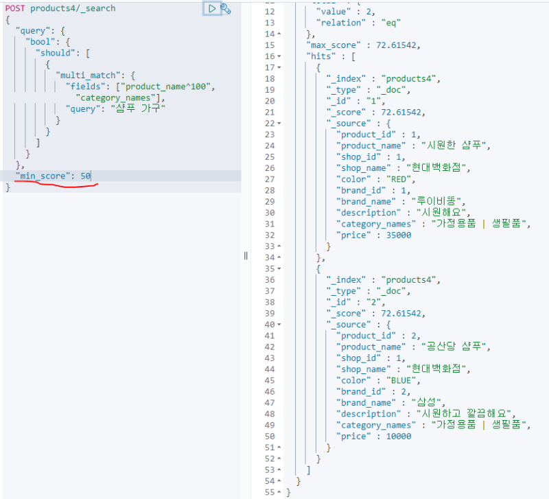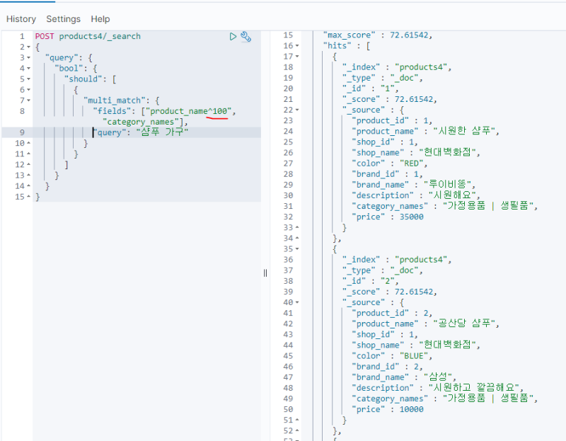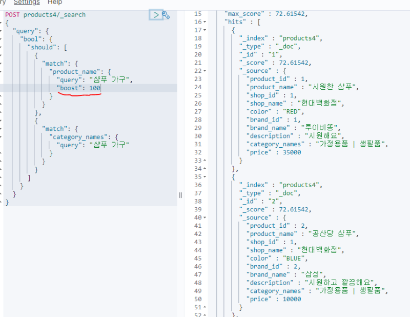 만약 여기서 상품명에 대한 검색 우선순위를 높이고 싶다면 다음과 같이 boost 옵션값을 넣어주면 된다.