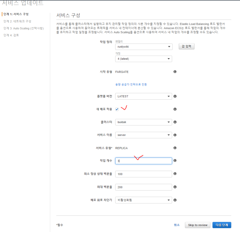 작업의 개수를 늘리거나 줄이고 싶다면 서비스 업데이트에 들어가 작업 개수를 늘리기만 하면 된다.