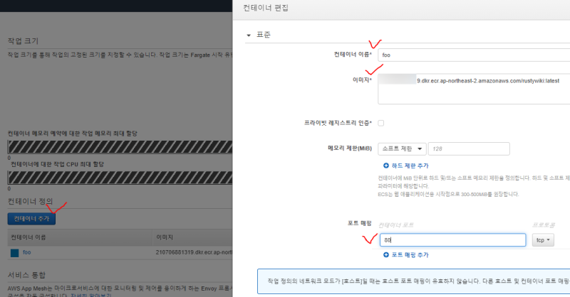 그리고 컨테이너 를 추가해, 이름과 레포지토리, 열어줄 포트 등을 지정해준다.
