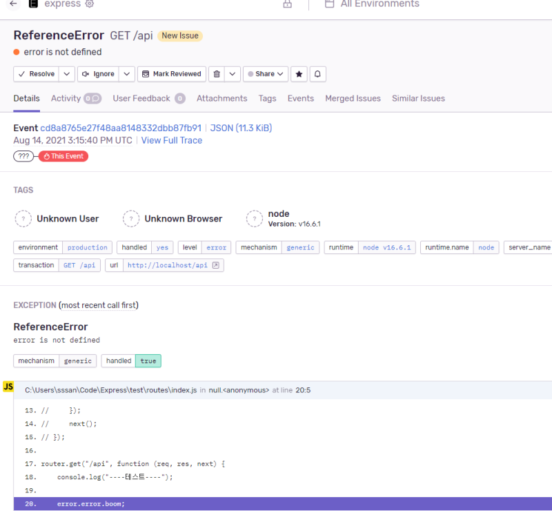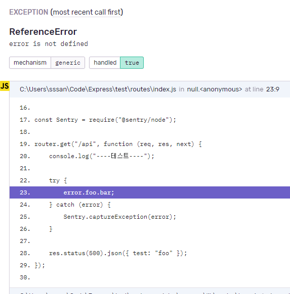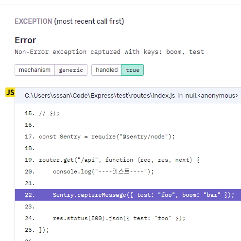 그리고 에러를 예외처리와 함께 기록하고 싶다면 다음과 같이 capture_error로 에러 객체를 넣어주면 된다.