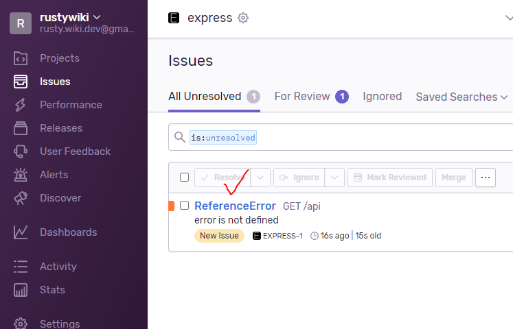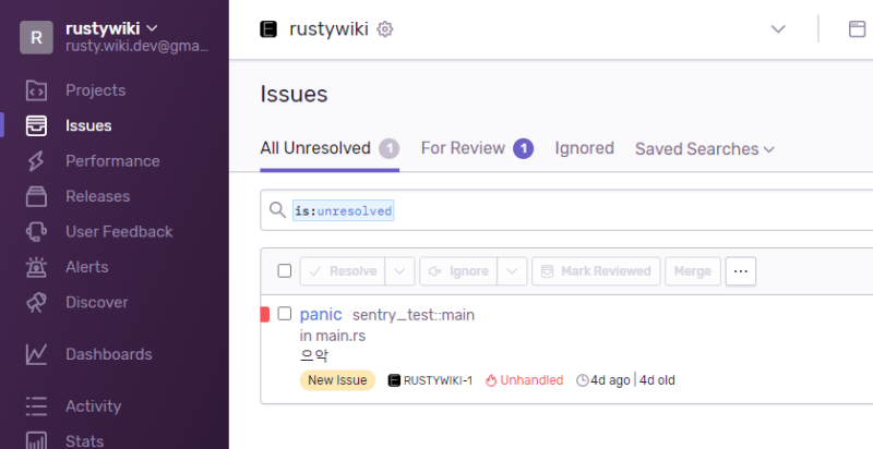 그럼 해당 프로젝트 목록의 이슈 탭에서 오류를 확인할 수 있다.