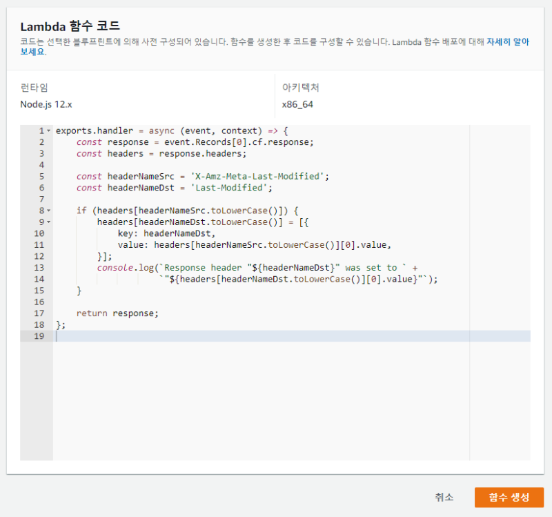 - ๋ธ๋ฃจํ๋ฆฐํธ๋ก ๋ค์ด๊ฐ์ cloudfront-modify-response-header๋ผ๋ ๊ฒ์ ์ ํํ๊ณ ์์ฑํ๋ค.