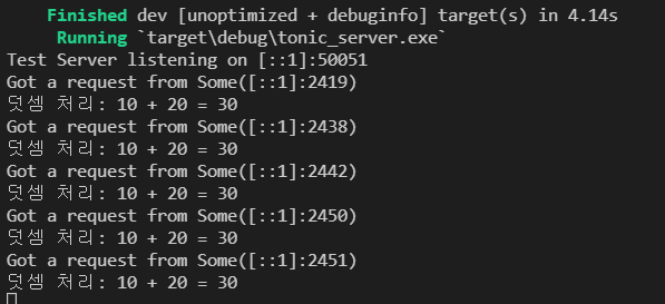 FooClient::connect로 요청을 보낼 주소를 지정해서 클라이언트 커넥션을 만들고, add 함수를 호출해서 응답을 받아온다.