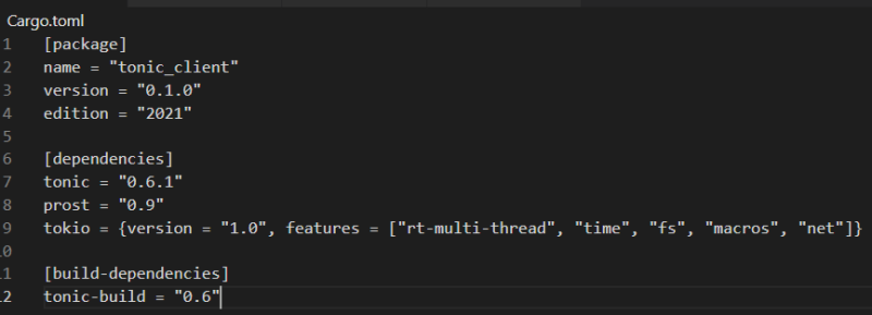 그리고 종속성은 다음과 같이 tonic과 tokio, tonic_build, prost 정도가 필요하다.