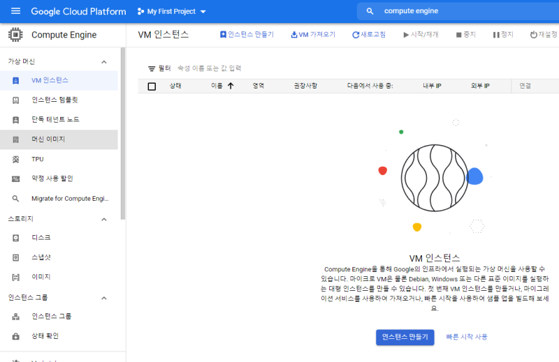 Compute Engine ํ์ด์ง๋ก ์ด๋ํด์, ์ธ์คํด์ค ๋ง๋ค๊ธฐ๋ฅผ ํด๋ฆญํ๋ค.