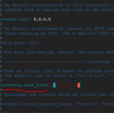 ๊ทธ๋ฆฌ๊ณ discovery.seed_hosts๋ผ๋ ํญ๋ชฉ๋ ์ฃผ์ ํด์ ํด์ ๋๊ฐ์ด ์ถ๊ฐํด์ค๋ค.