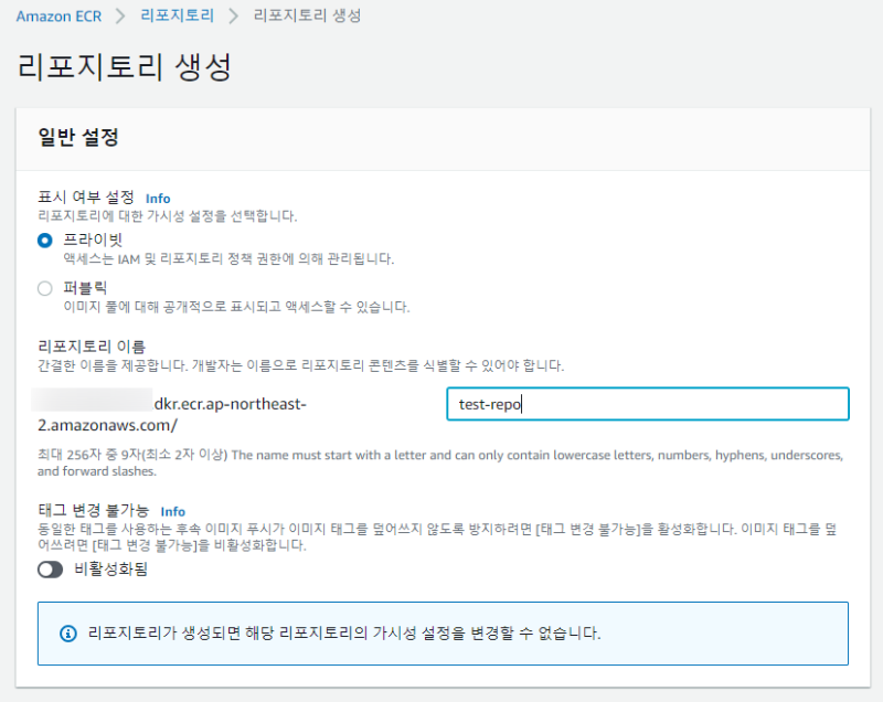 먼저 ECR에 들어가서 배포용 이미지를 관리할 도커 레포지토리를 만들어준다.