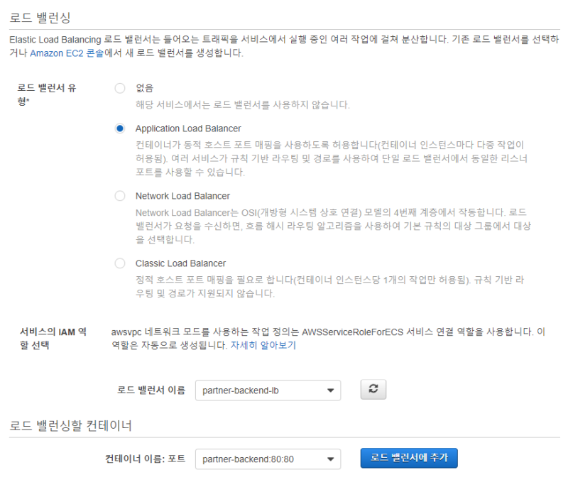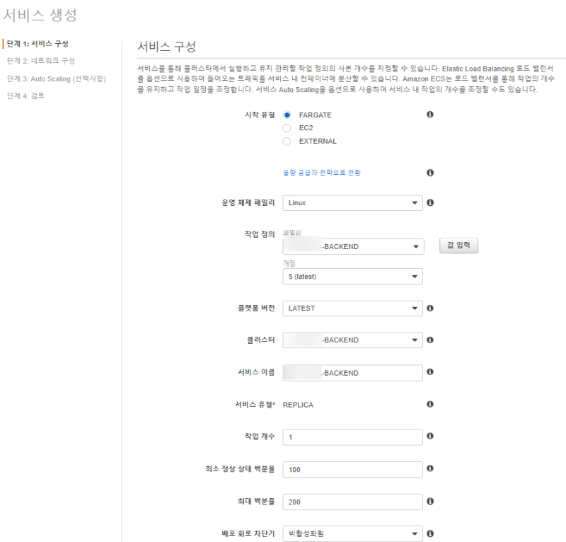 다음엔 클러스터에 방금 만든 작업정의를 기반으로 "서비스"를 생성하면, 이제 기본적인 세팅은 거의 다 된 것이다.
