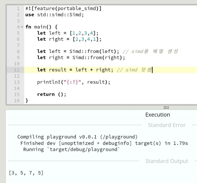 Rust์์๋ ์์ง unstableํ ๊ธฐ๋ฅ์ด์ง๋ง, simd ์ฐ์ฐ๊ธฐ๋ฅ์ ํ์ค ๋ผ์ด๋ธ๋ฌ๋ฆฌ์์ ์ ๊ณตํ๋ค.