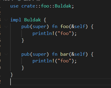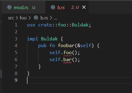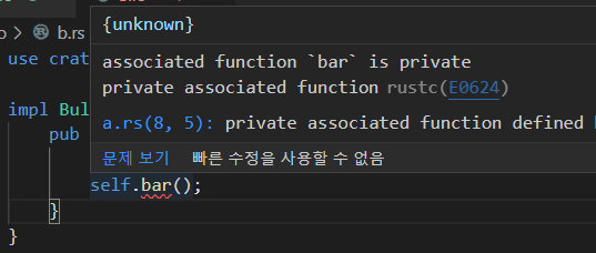 원래 메서드 정의에 아무것도 붙이지 않을 경우에 붙는 접근제어자는 pub(self)로, 동일 모듈 내에서만 접근이 가능하다. 그래서 같은 소스코드(모듈)에 있을 경우에는 문제가 없었지만 분리가 되니 서로를 찾을 수 없게 된 것이다.