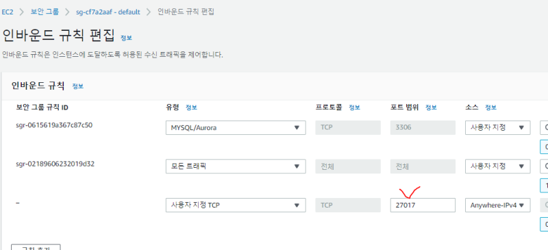์ ๋ณด์๊ทธ๋ฃน์ผ๋ก ๋ค์ด๊ฐ์, ์ธ๋ฐ์ด๋ ๊ท์น์ mongodb์ ํฌํธ๊ฐ ์๋ค๋ฉด ์ถ๊ฐํด์ค๋ค.
