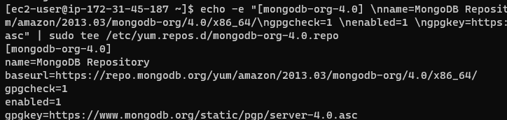 echo -e "[mongodb-org-4.0] \nname=MongoDB Repository\nbaseurl=https://repo.mongodb.org/yum/amazon/2013.03/mongodb-org/4.0/x86_64/\ngpgcheck=1 \nenabled=1 \ngpgkey=https://www.mongodb.org/static/pgp/server-4.0.asc" | sudo tee /etc/yum.repos.d/mongodb-org-4.0.repo