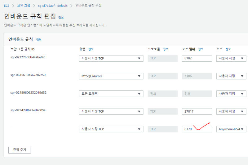 아 그리고, 접속을 위해서 아까 넣은 보안그룹의 인바운드에 redis 포트를 추가해준다.