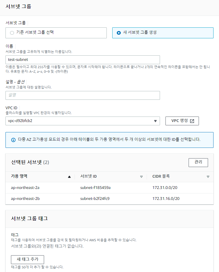 그리고 서브넷을 2개 이상 골라준다.