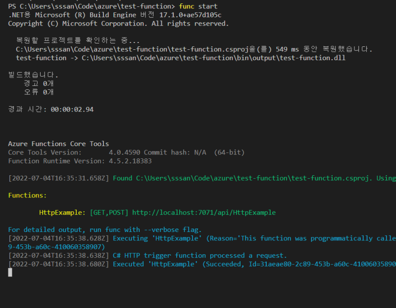 Azure Function์ ์ข ๋ถํธํ๊ฒ๋ ์ฝ์์์ ๋ฐ๋ก ์ฝ๋๋ฅผ ๋ณด๊ฑฐ๋ ๊ณ ์น ์๋ ์๋ค.