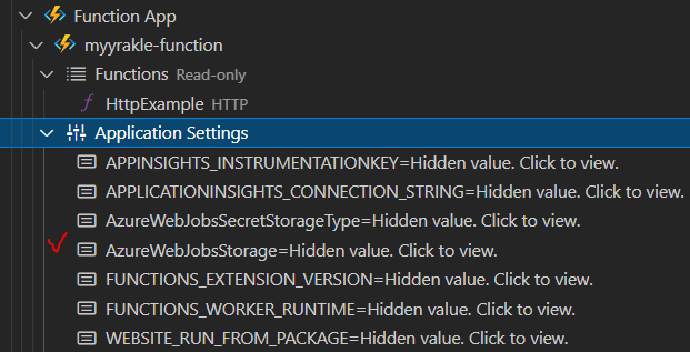 "AzureWebJobsStorage": "UseDevelopmentStorage=true" ์ธํ ๊ฐ์ ์ถ๊ฐํด์ค๋ค.