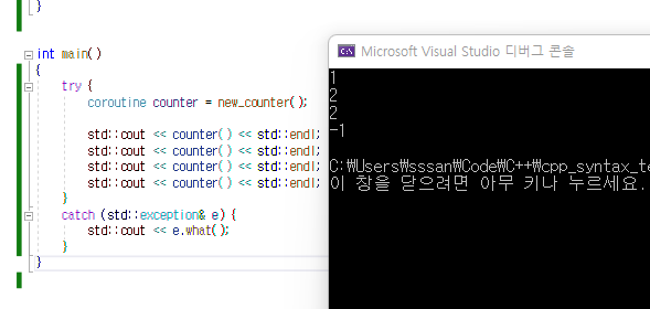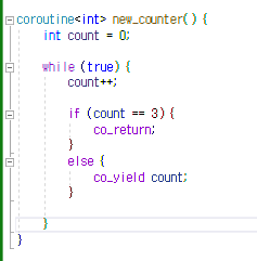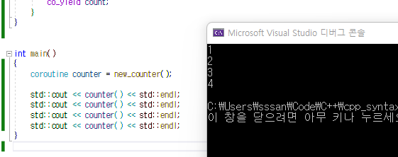 co_yield count; // ๋ฐํํ ํ, ๋ค์ ์คํ๋๋ฉด ๋ค์ ๋์์ด
