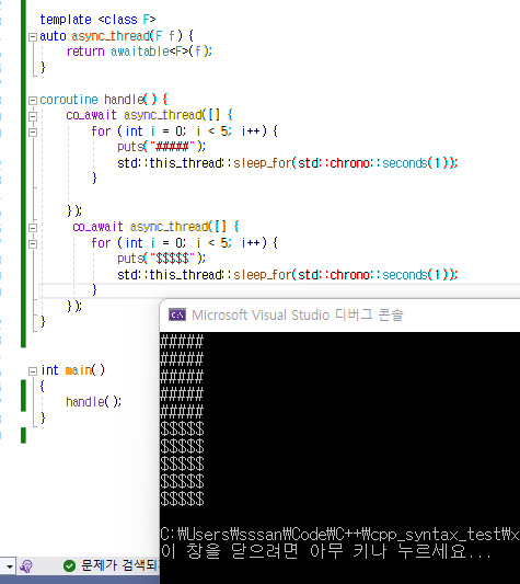 ์ด 2๊ฐ์ ์ค๋ ๋๋ฅผ ์ฌ๋ฆฌ์ง๋ง, co_await์ผ๋ก ํธ๋ค๋ง์ ํด์ ์ฒซ๋ฒ์งธ ์ค๋ ๋๊ฐ ์ข