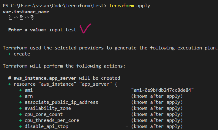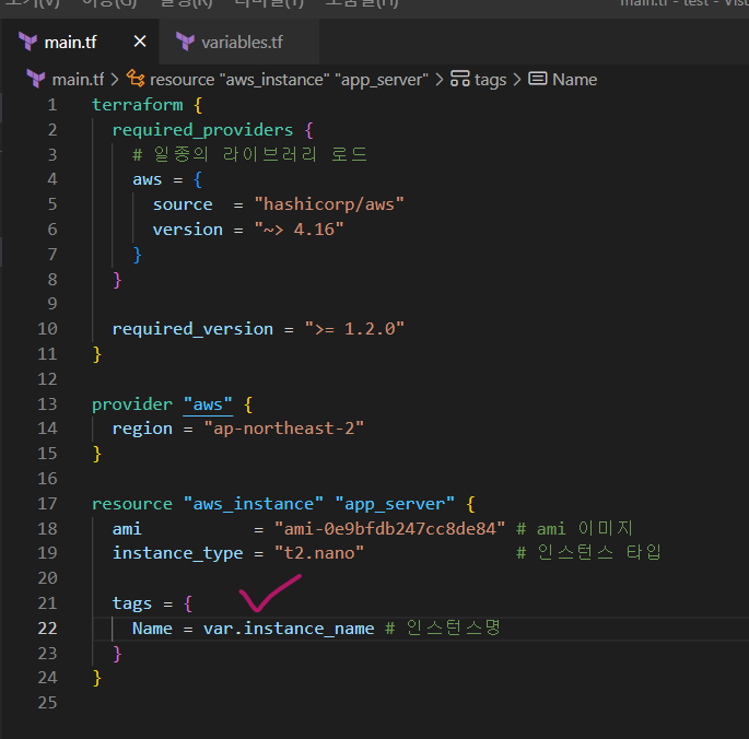 그리고 resource 구문을 통해 ec2 인스턴스 리소스를 정의했다.