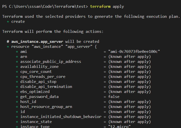 작성한 테라폼 리소스를 생성하려면 apply 명령을 사용하면 된다.
