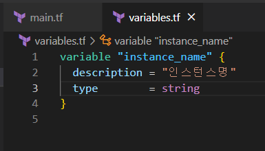 먼저 변수 설정용 tf 파일을 작성해서, 다음과 같이 변수를 정의한다.