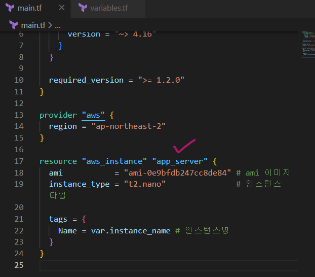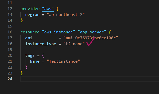 그리고 resource 구문을 통해 ec2 인스턴스 리소스를 정의했다.
