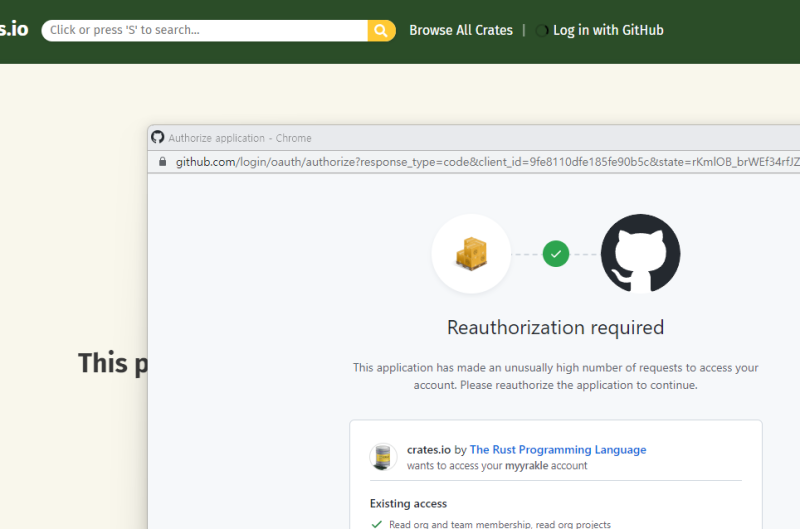 crates는 로그인 방식이 github 뿐이라서 인증을 사용하려면 연동을 따로 해줘야 한다.